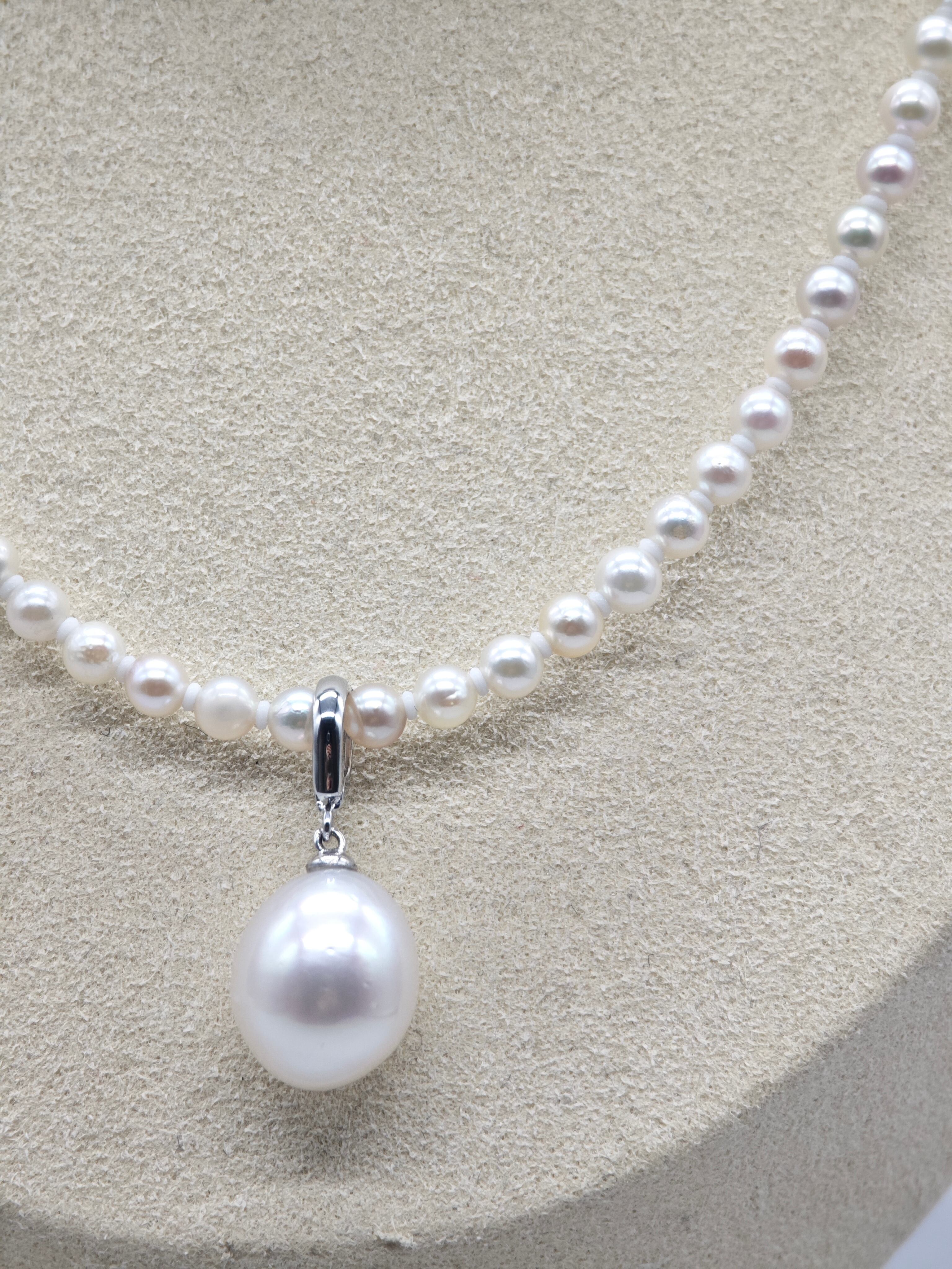 大小の真珠が織りなすグラデーションが、胸元に自然な立体感を与えます。