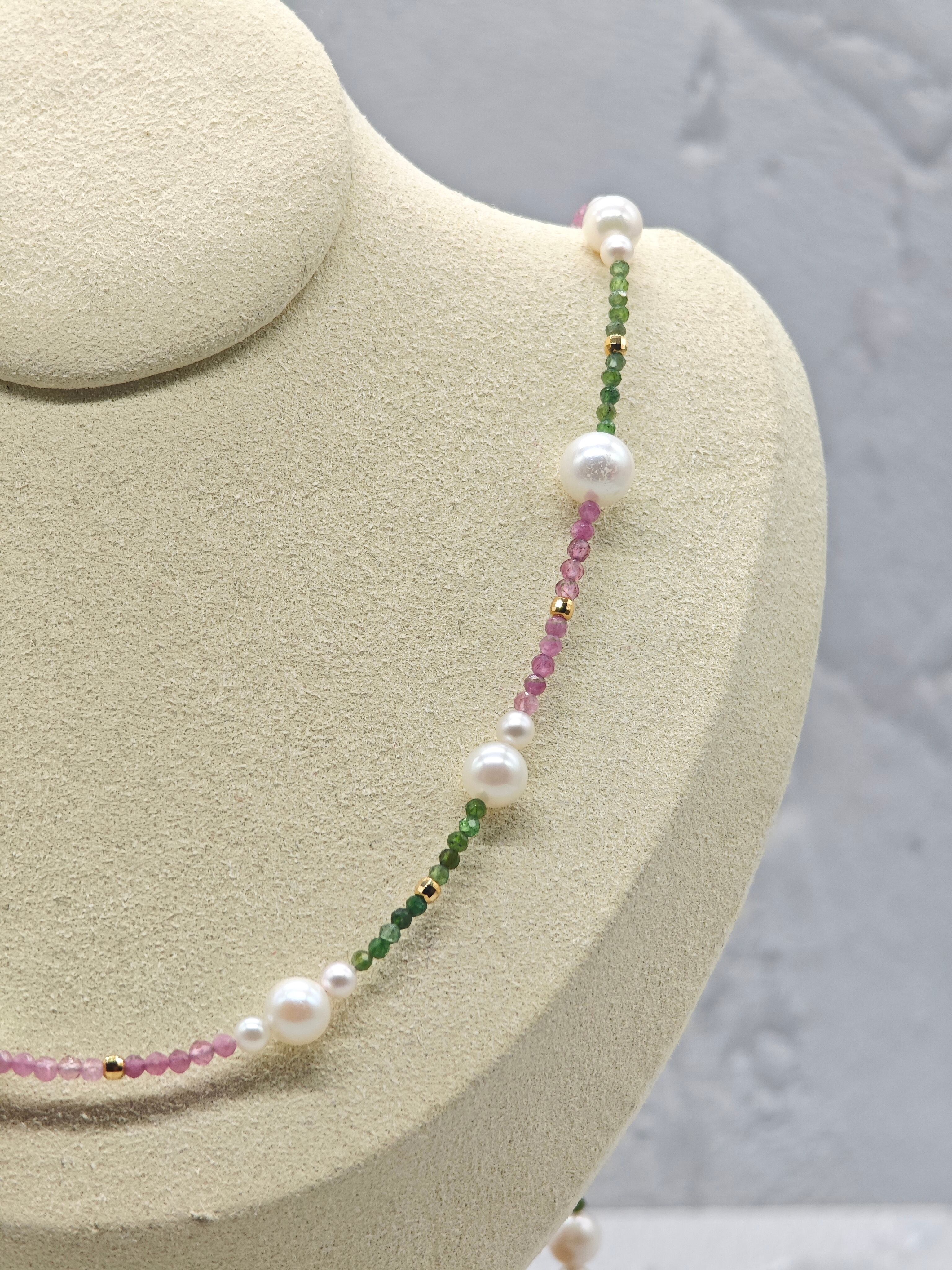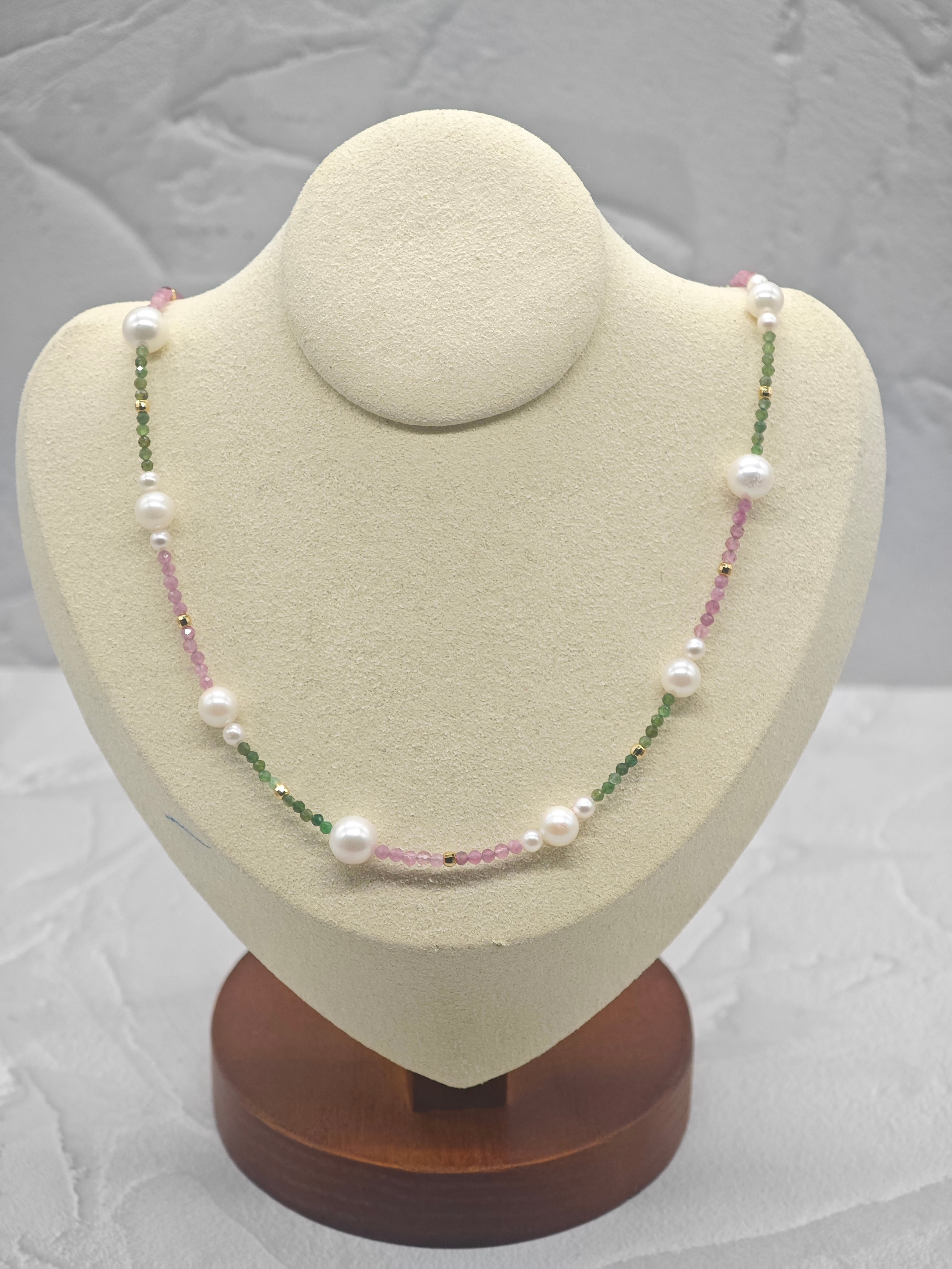 ピンクとグリーンの半貴石をあこや真珠で優しくつなぎ、