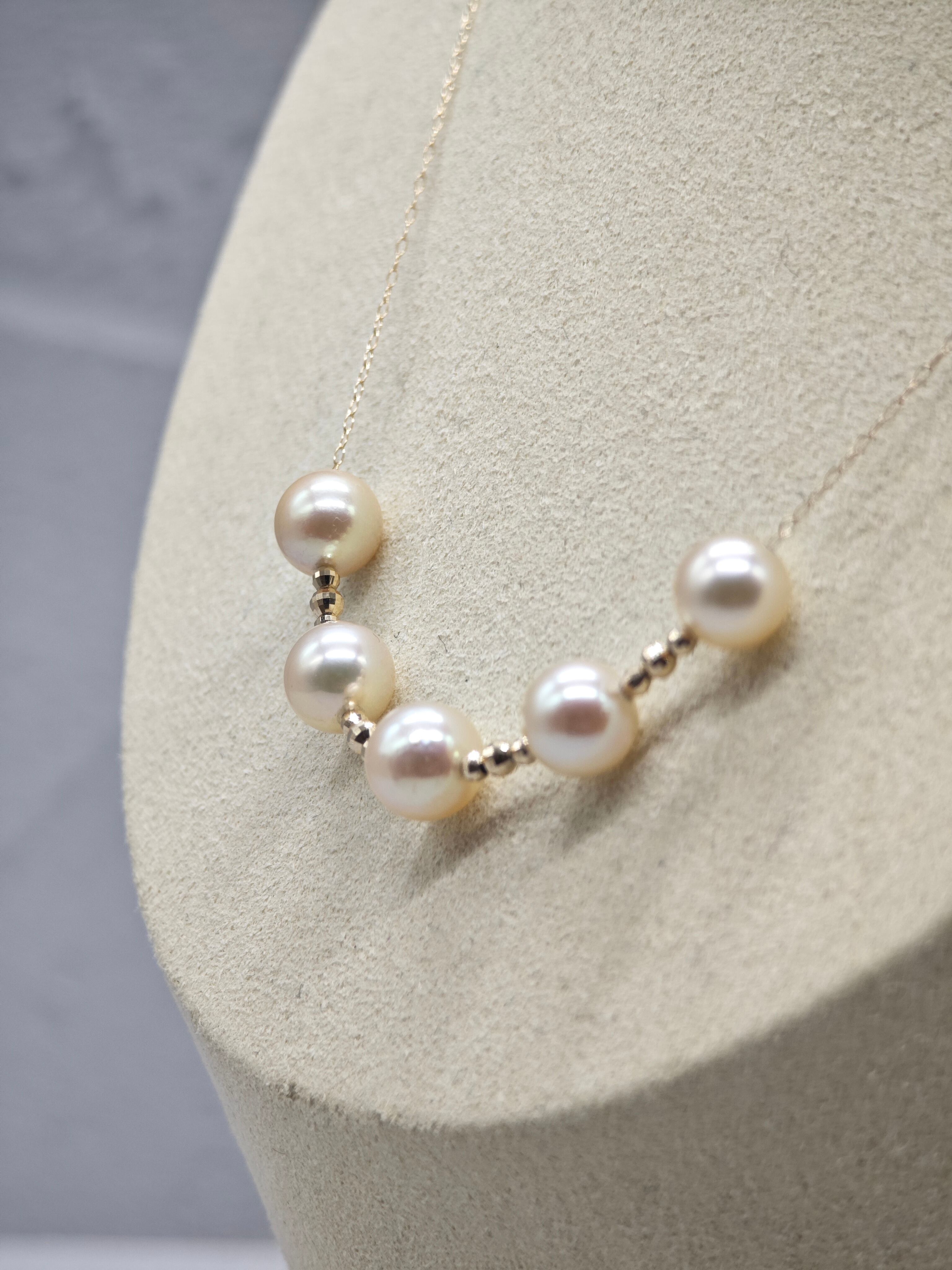 上質な艶を放つあこや真珠を、やわらかなカーブを描くように配したファッションネックレス。