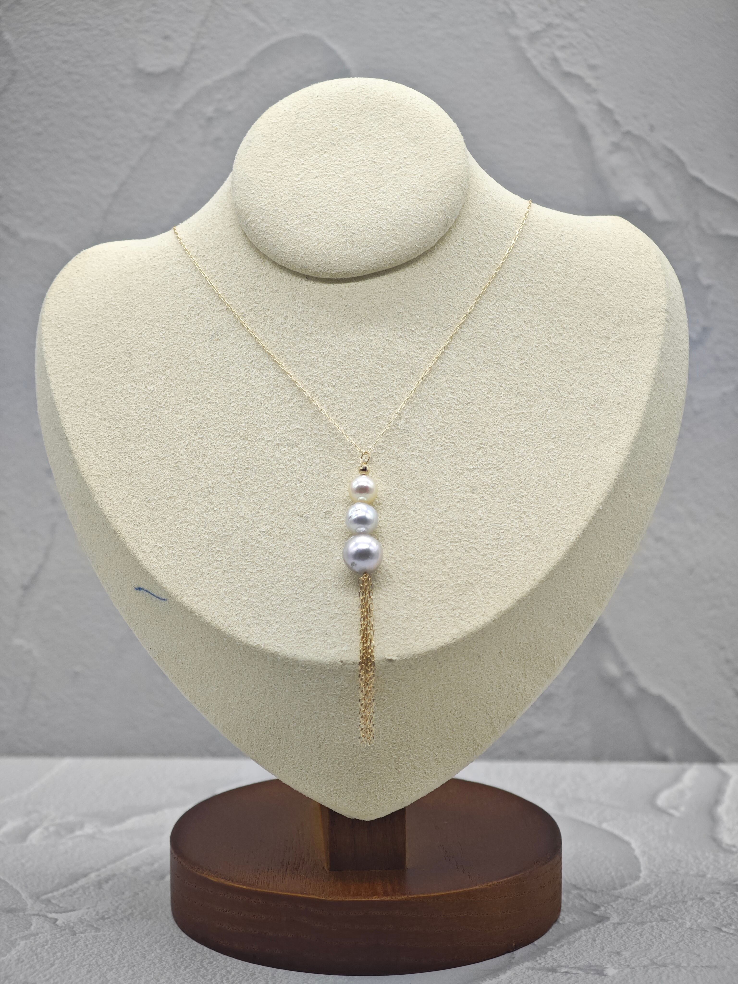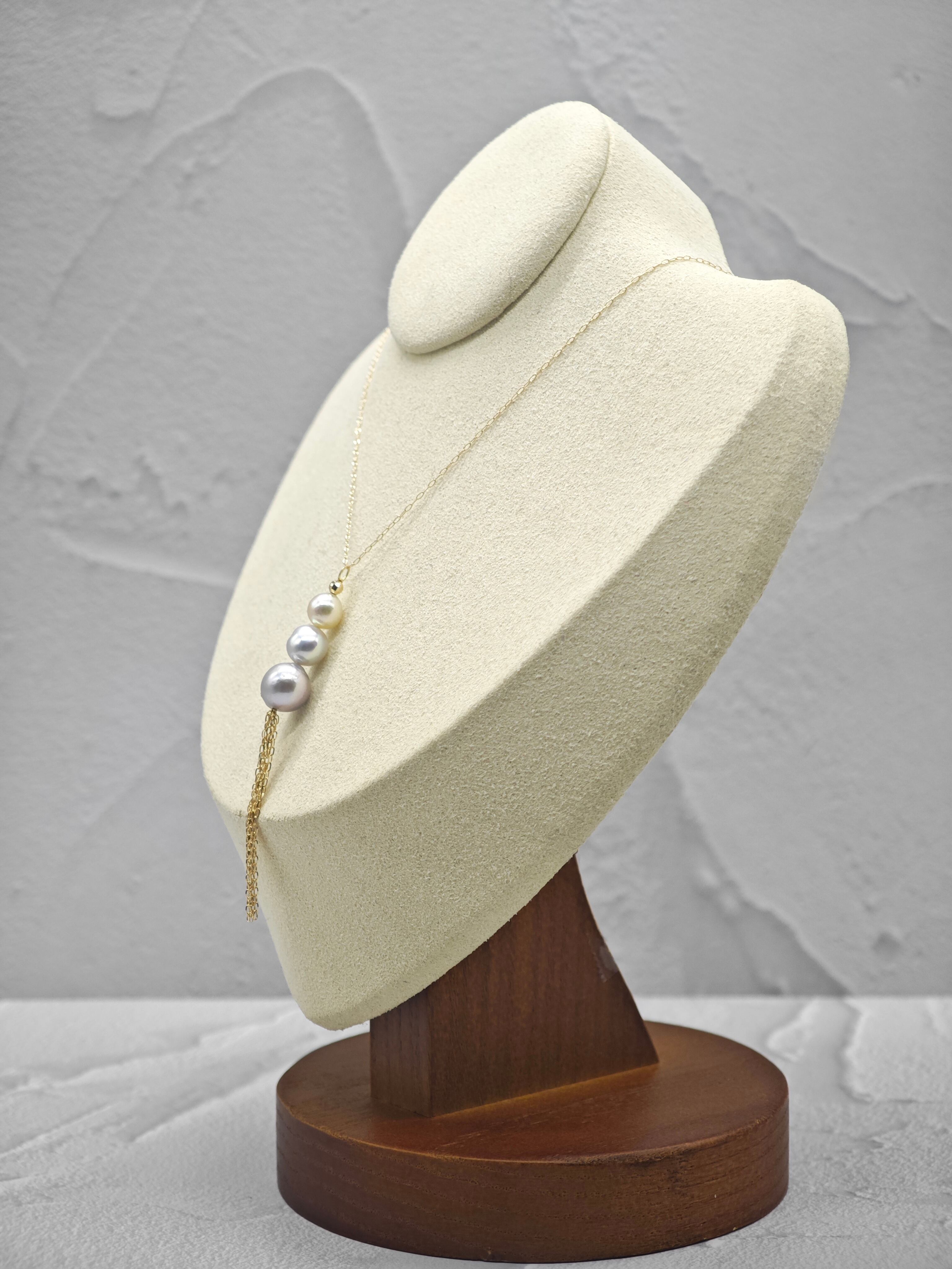 大小3粒の真珠が連なり、光を受けるたびに異なる表情を見せます。
