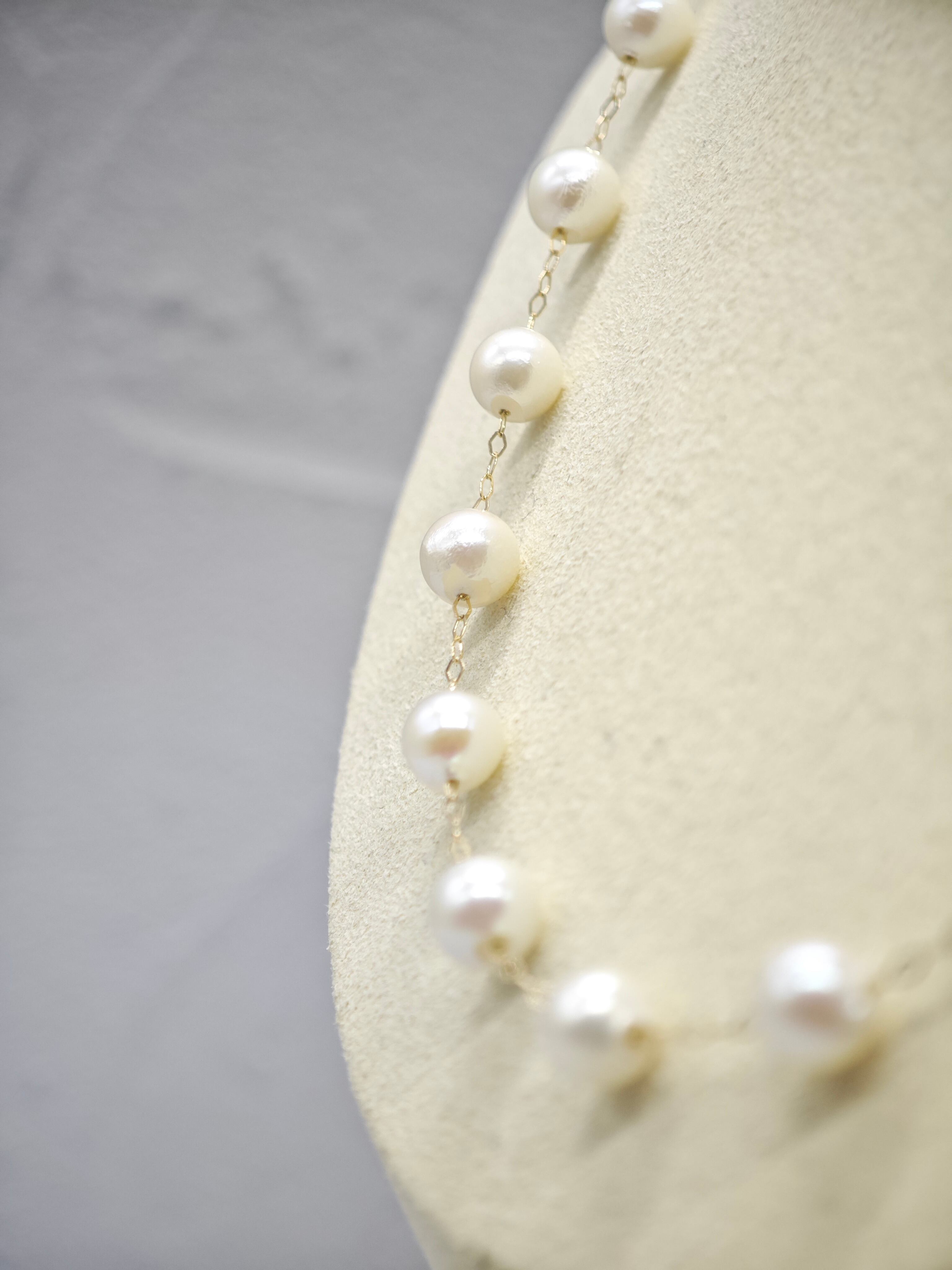 無調色真珠ならではのほんのりとした生成りの色合いが、肌に溶け込むように馴染み、