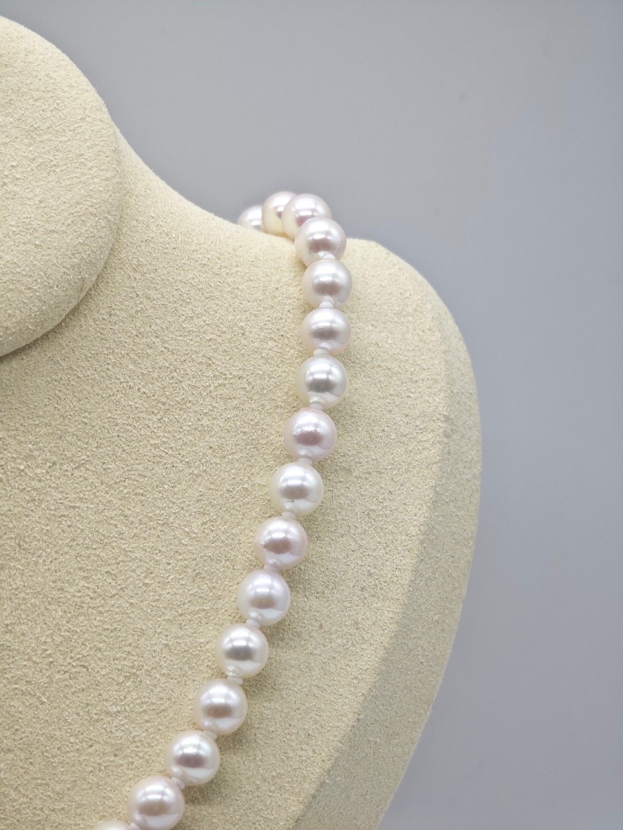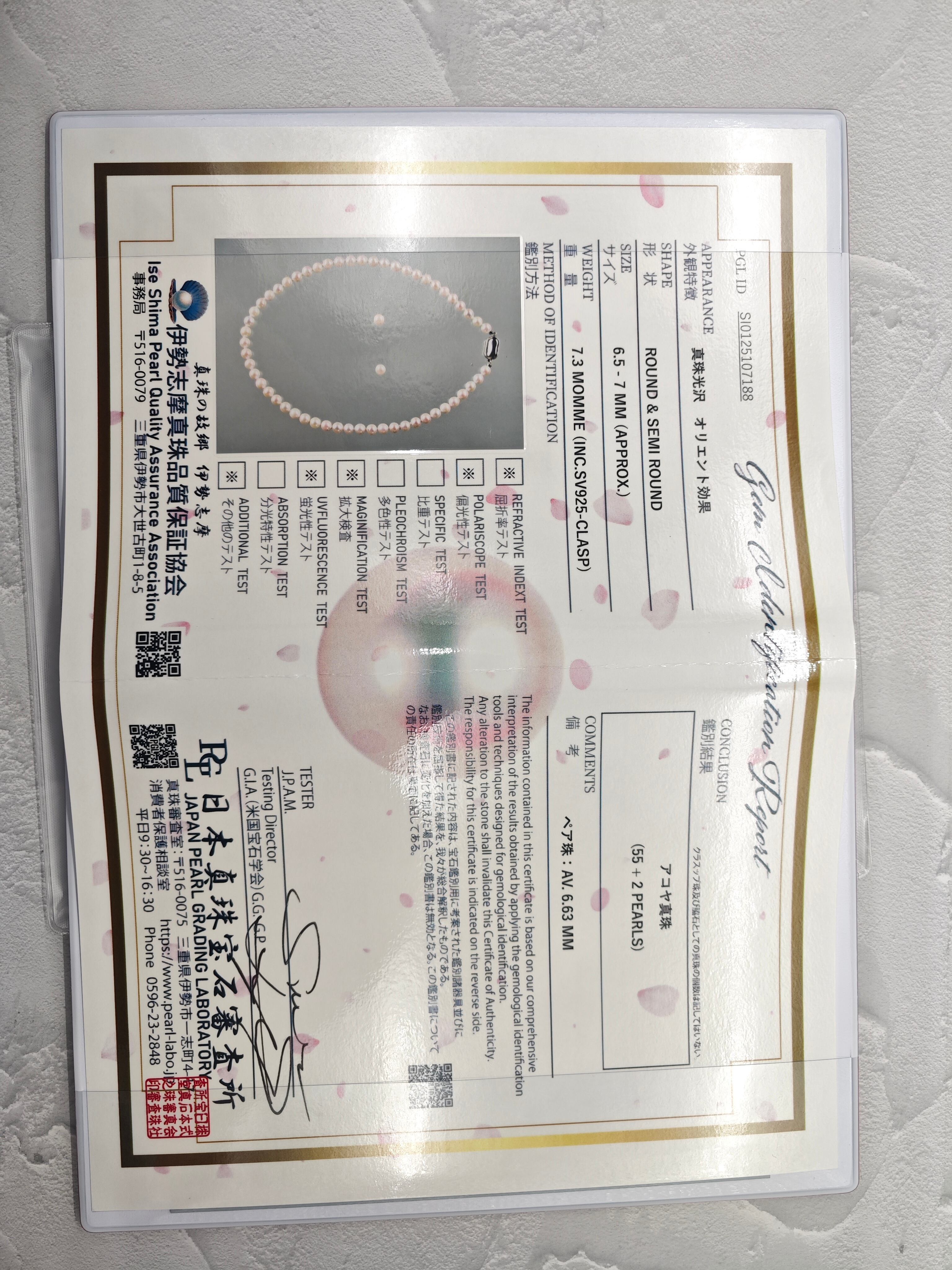 真珠科学研究所による鑑別書付きで、品質・真珠種・サイズが明確に保証された一本。