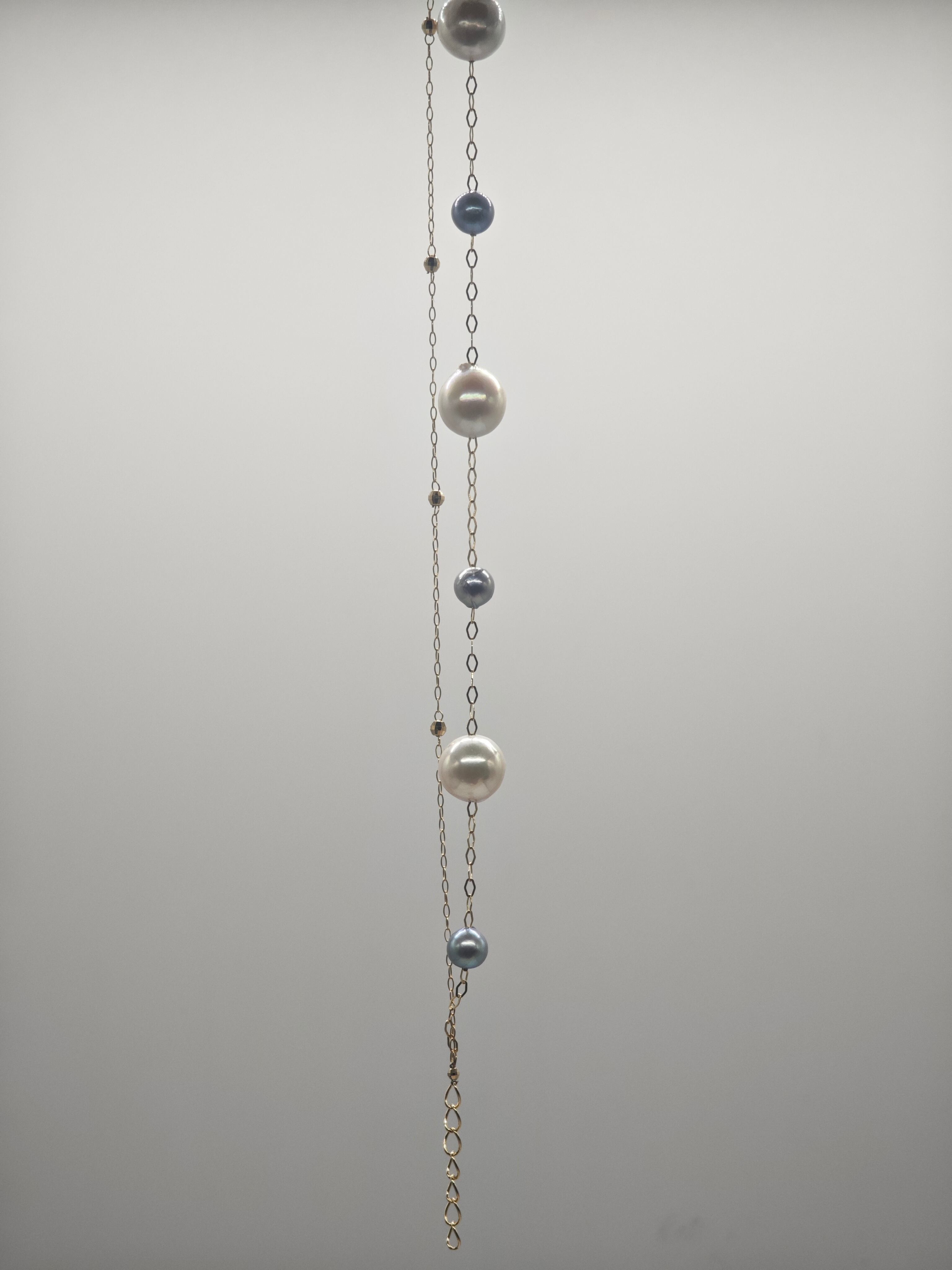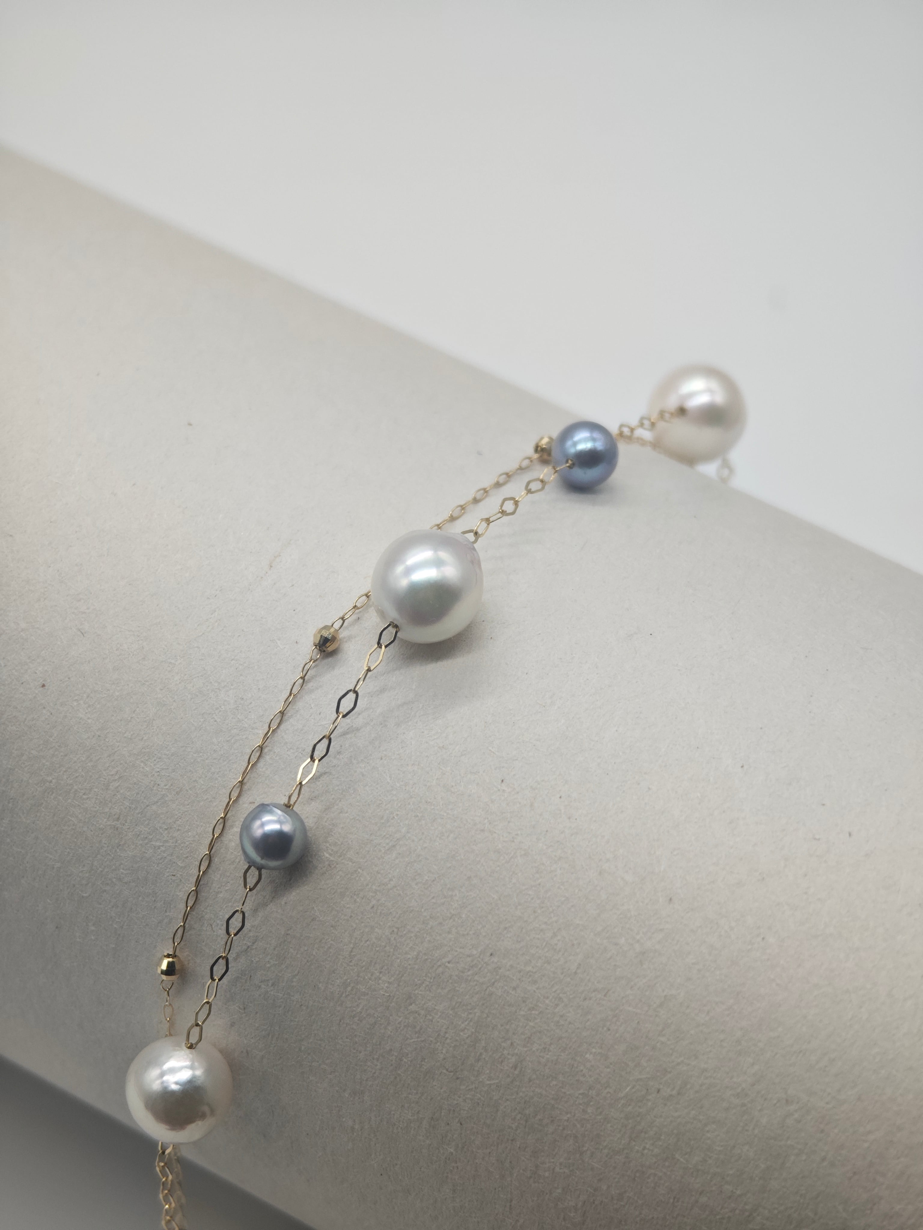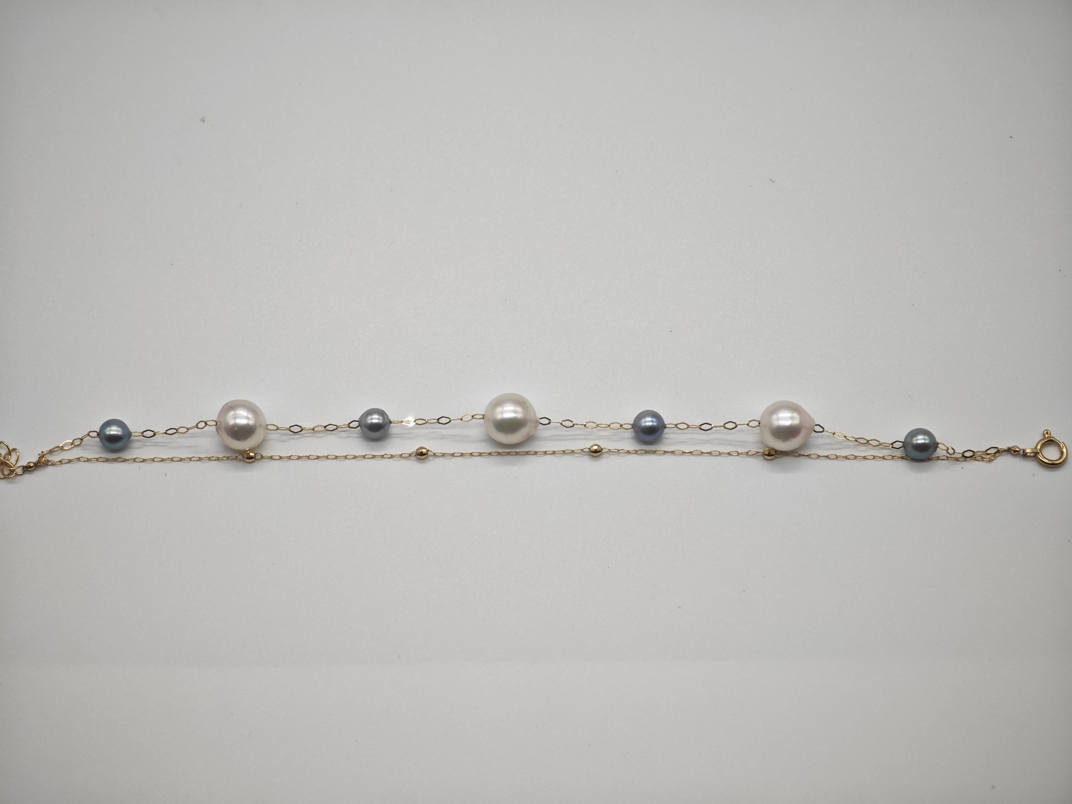 異なるサイズのあこや真珠を、繊細なK18チェーンに軽やかに連ねたブレスレット。
