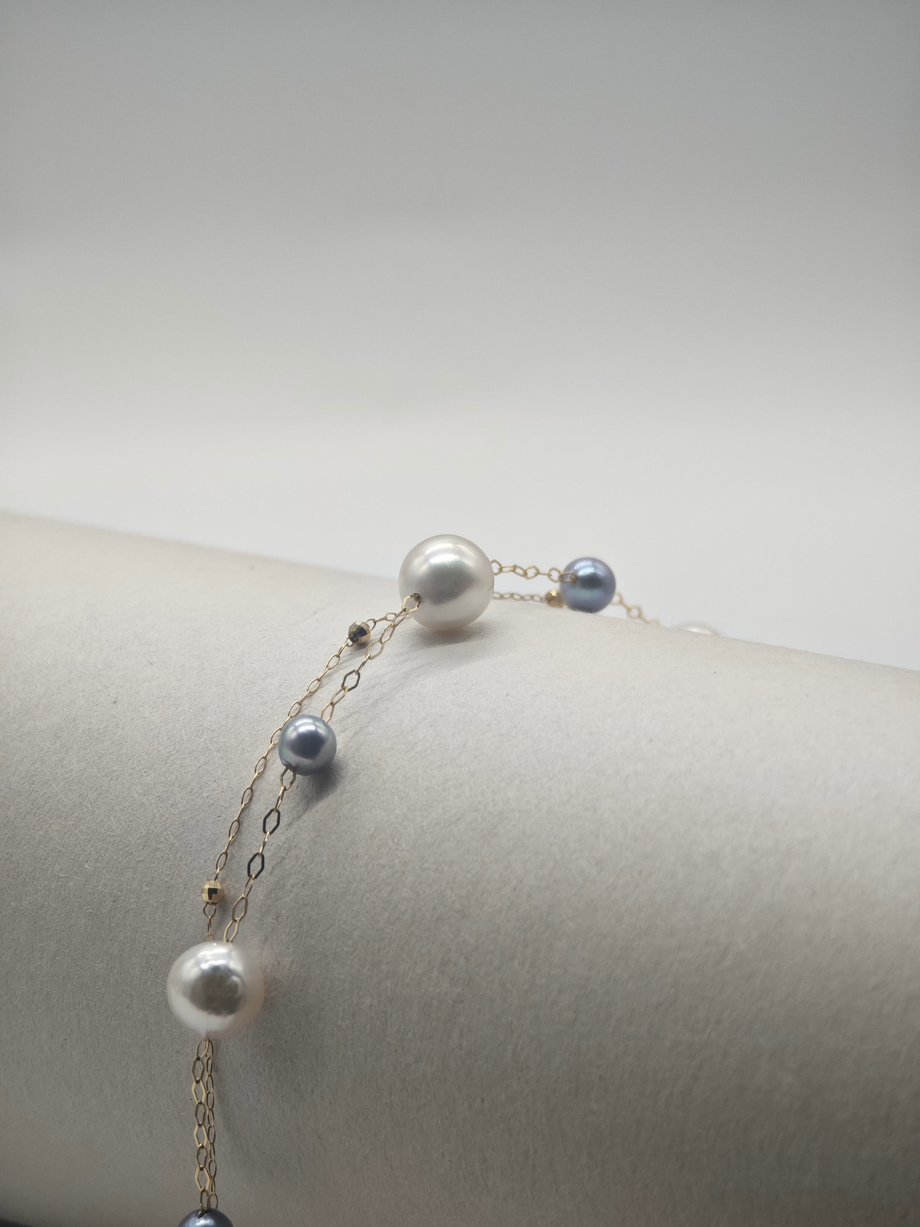 ホワイトと淡いブルーグレーの真珠が穏やかに輝き、手元に上品な彩りを添えます。