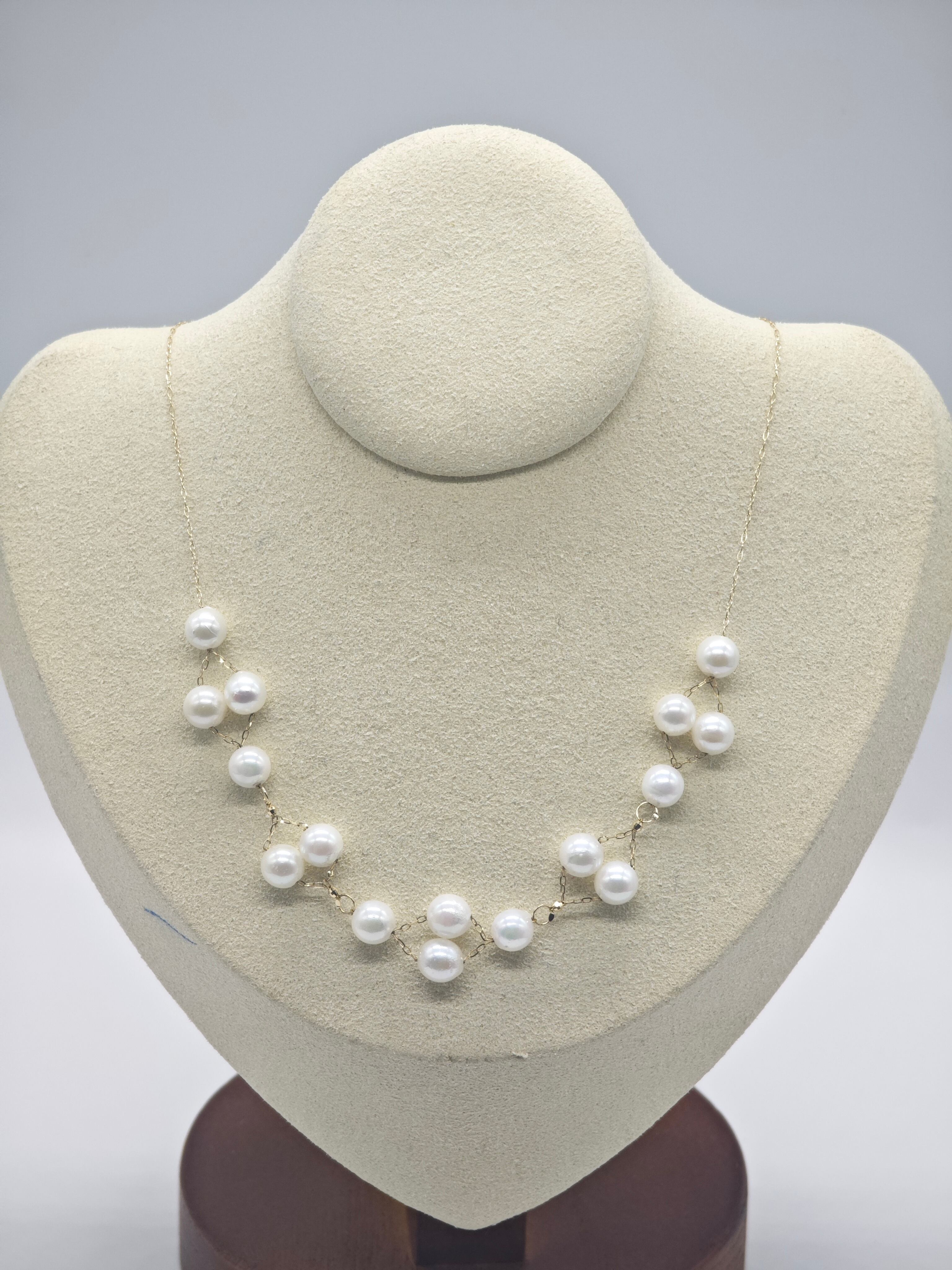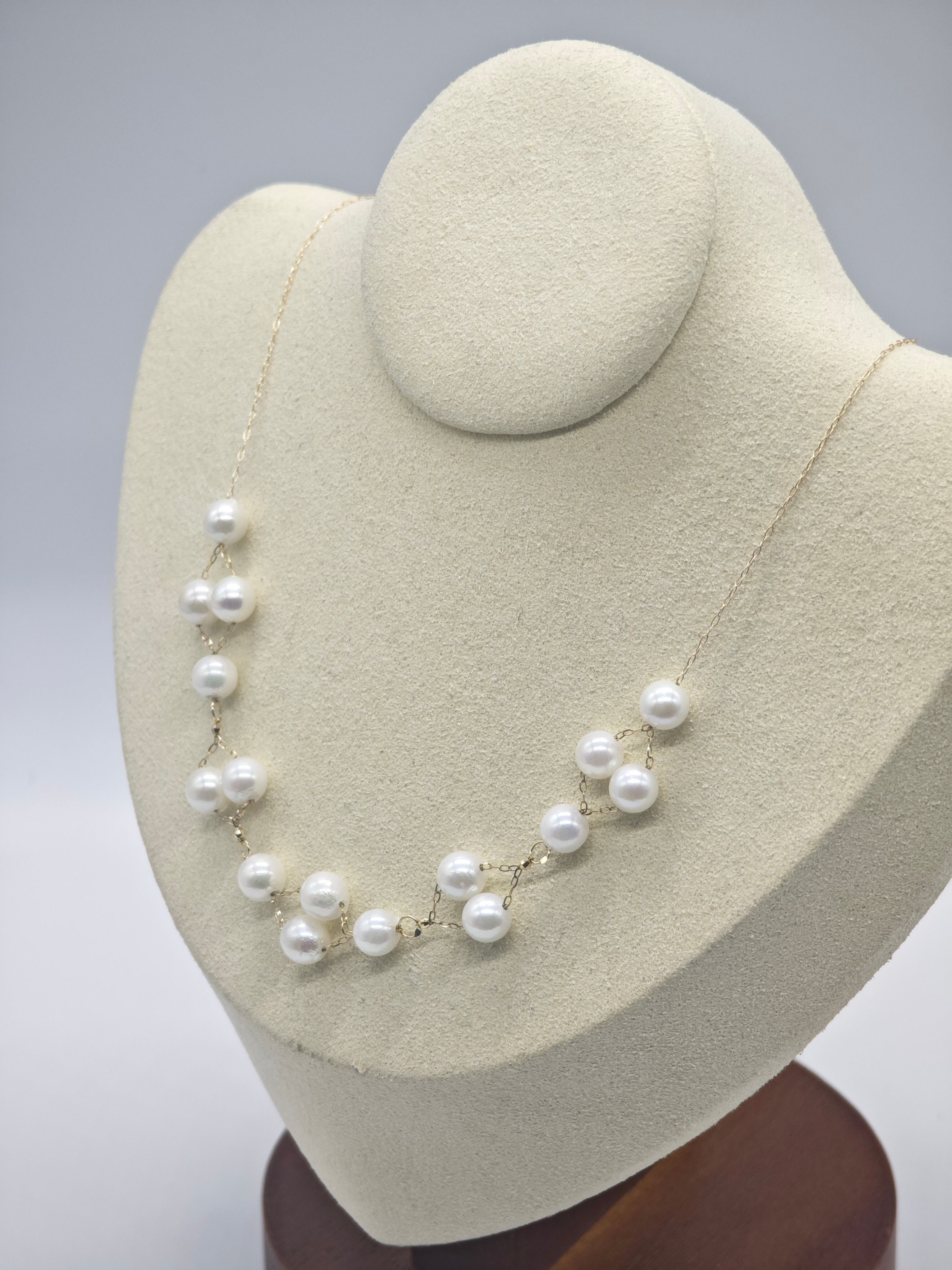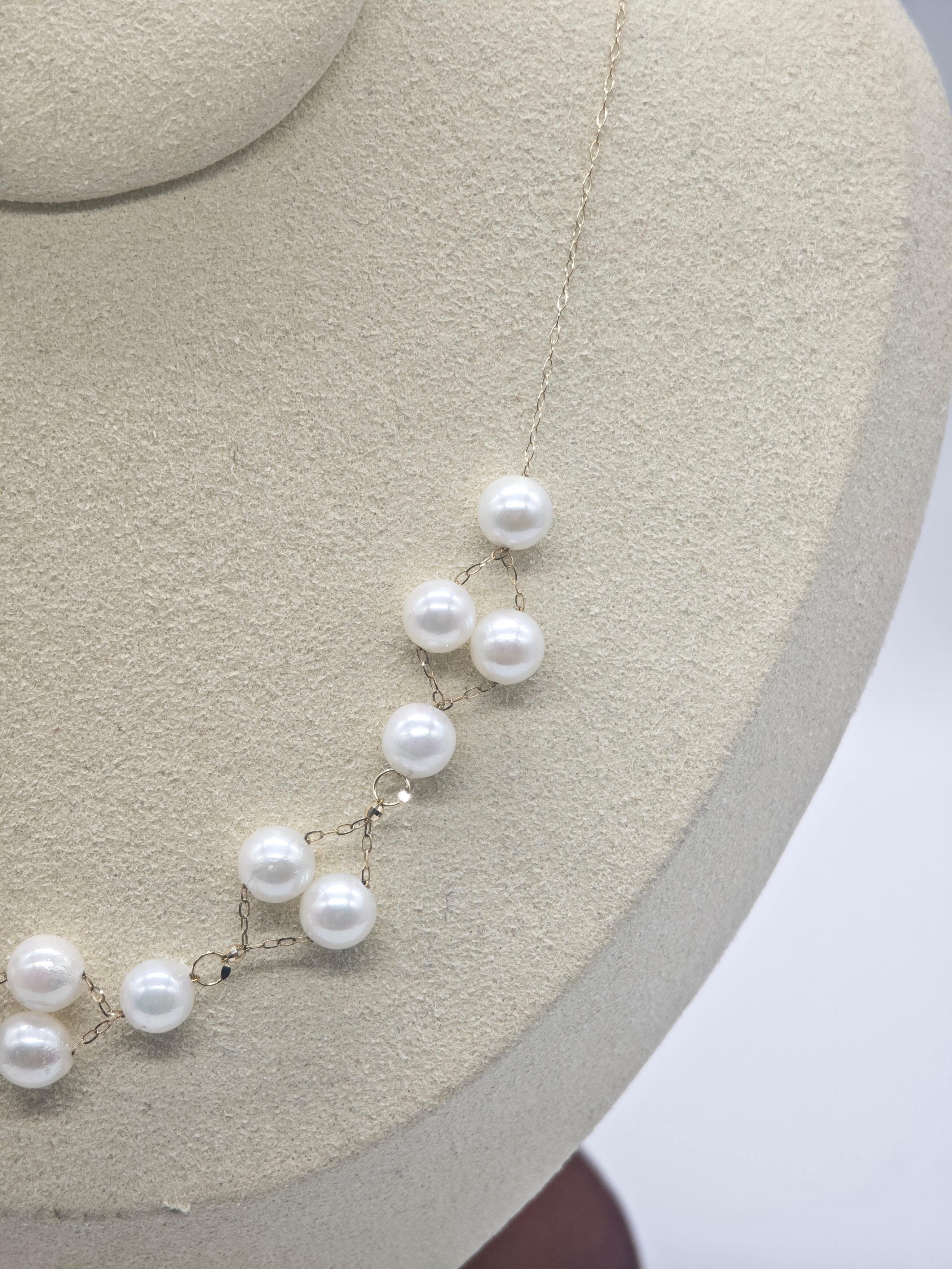 無着色のあこや真珠を、繊細なK18チェーンでリズミカルに連ねたファッションネックレス。