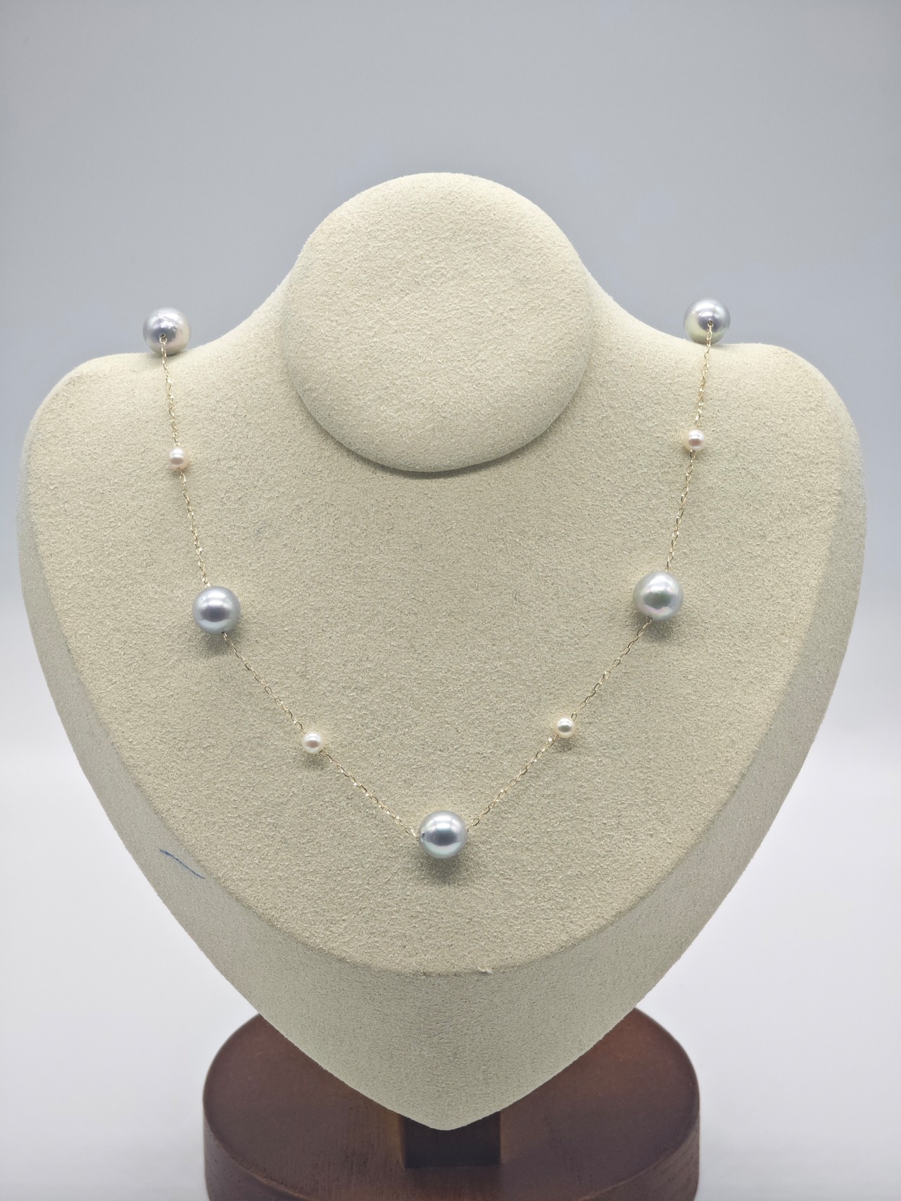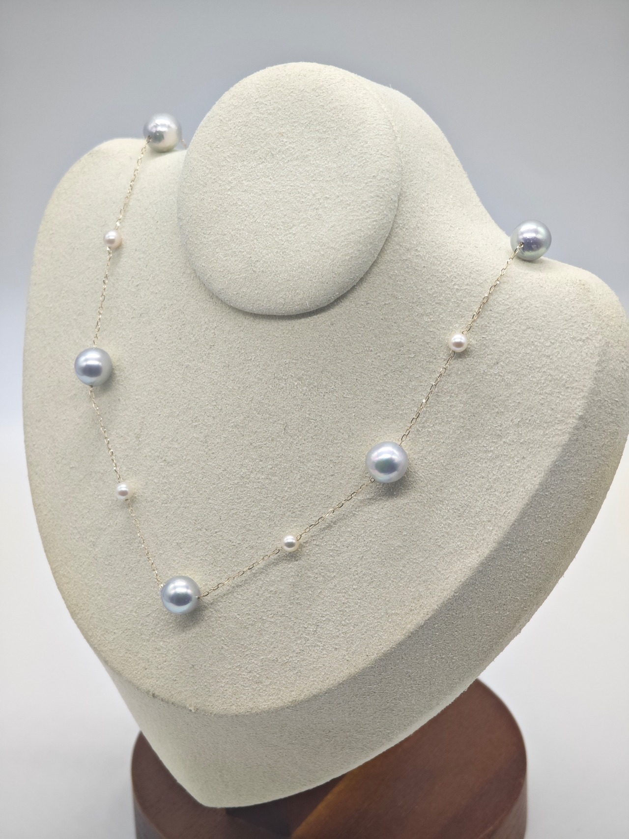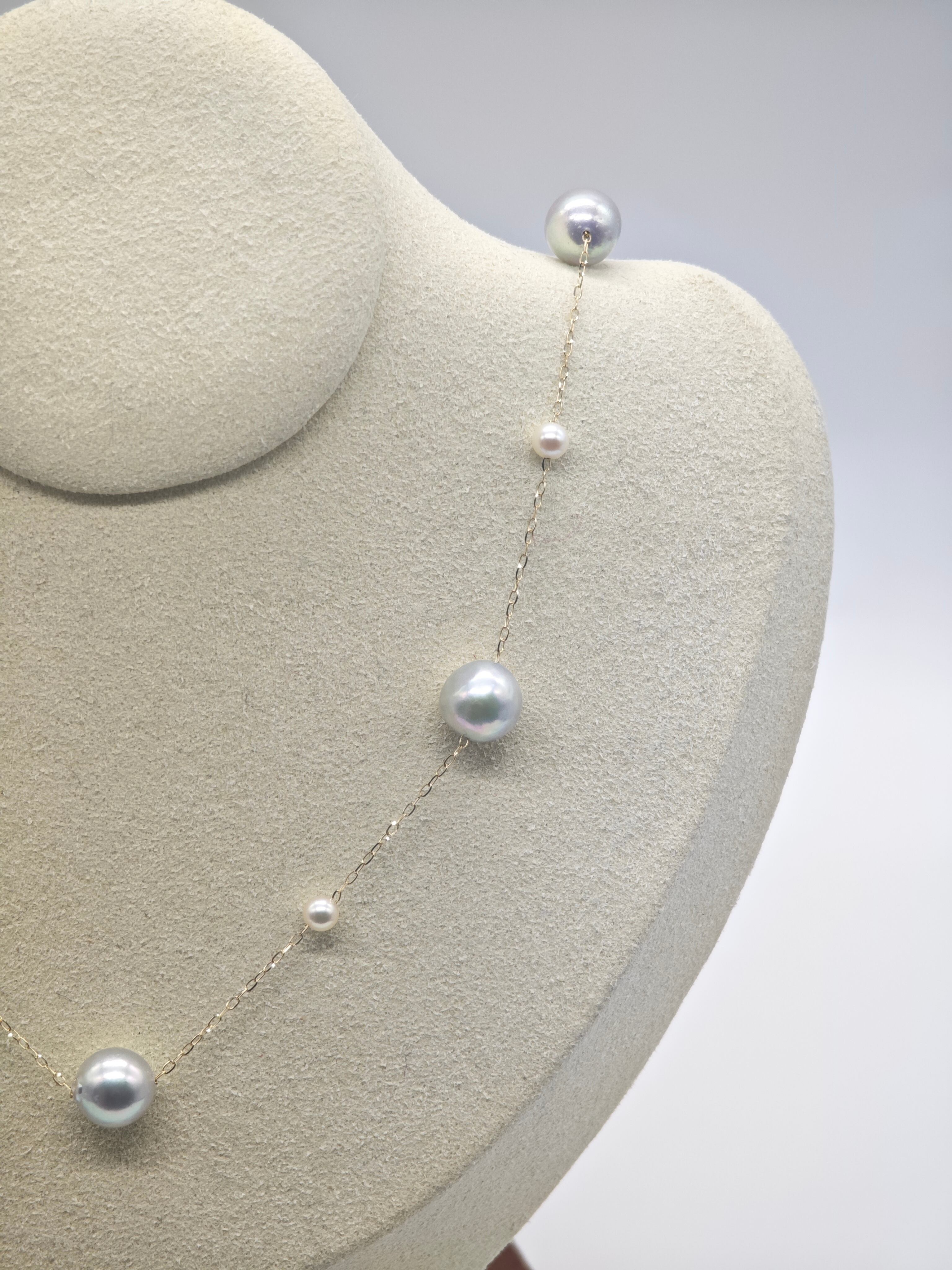 大小さまざまなあこや真珠を、繊細なK18チェーンにランダムに配したステーションネックレス。